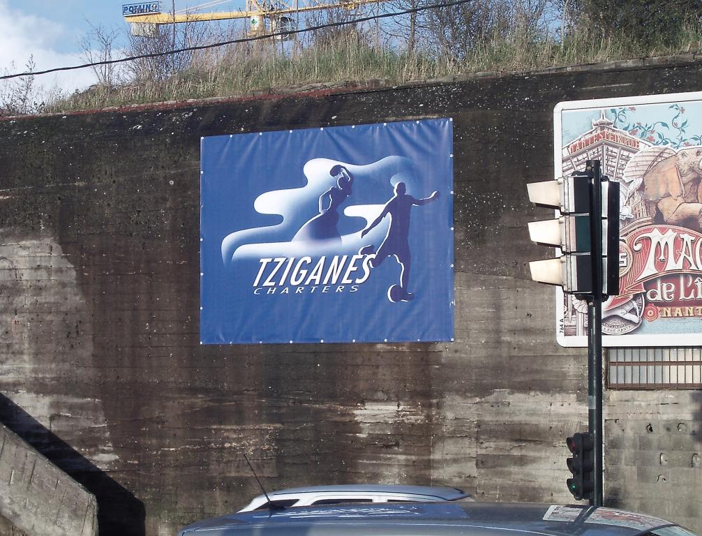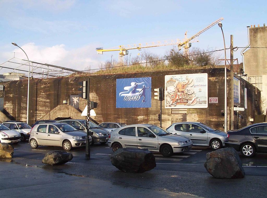 impression 4X3m sur bâche plastique apposée à la façade du Blockhaus DY10 à Nantes depuis la fin 2008 pour l'exposition société écran Blockhaus DY10, 5 Boulevard Léon Bureau, 44000 Nantes, Loire-Atlantique, Pays de la Loire